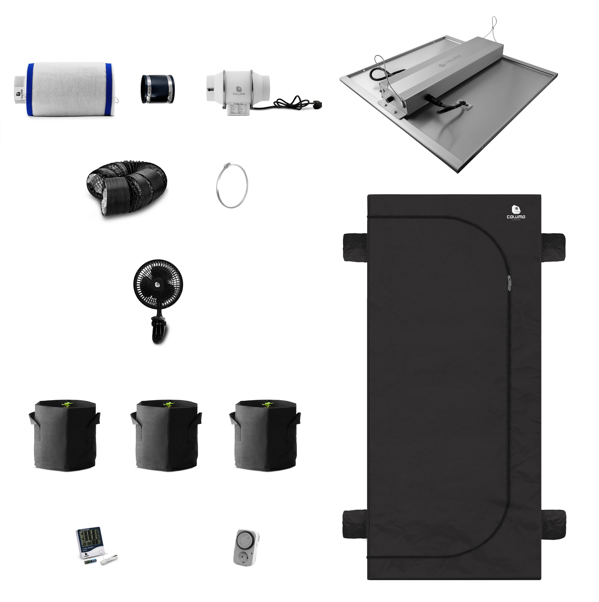 The Caluma sets make it as easy as possible for you to get started with indoor cultivation. The sets are named after the number of plants that can be accommodated in each tent. There are also two variants for each tent size. One, with a slightly weaker Caluma Force LED, the other variant contains the next most powerful lamp.