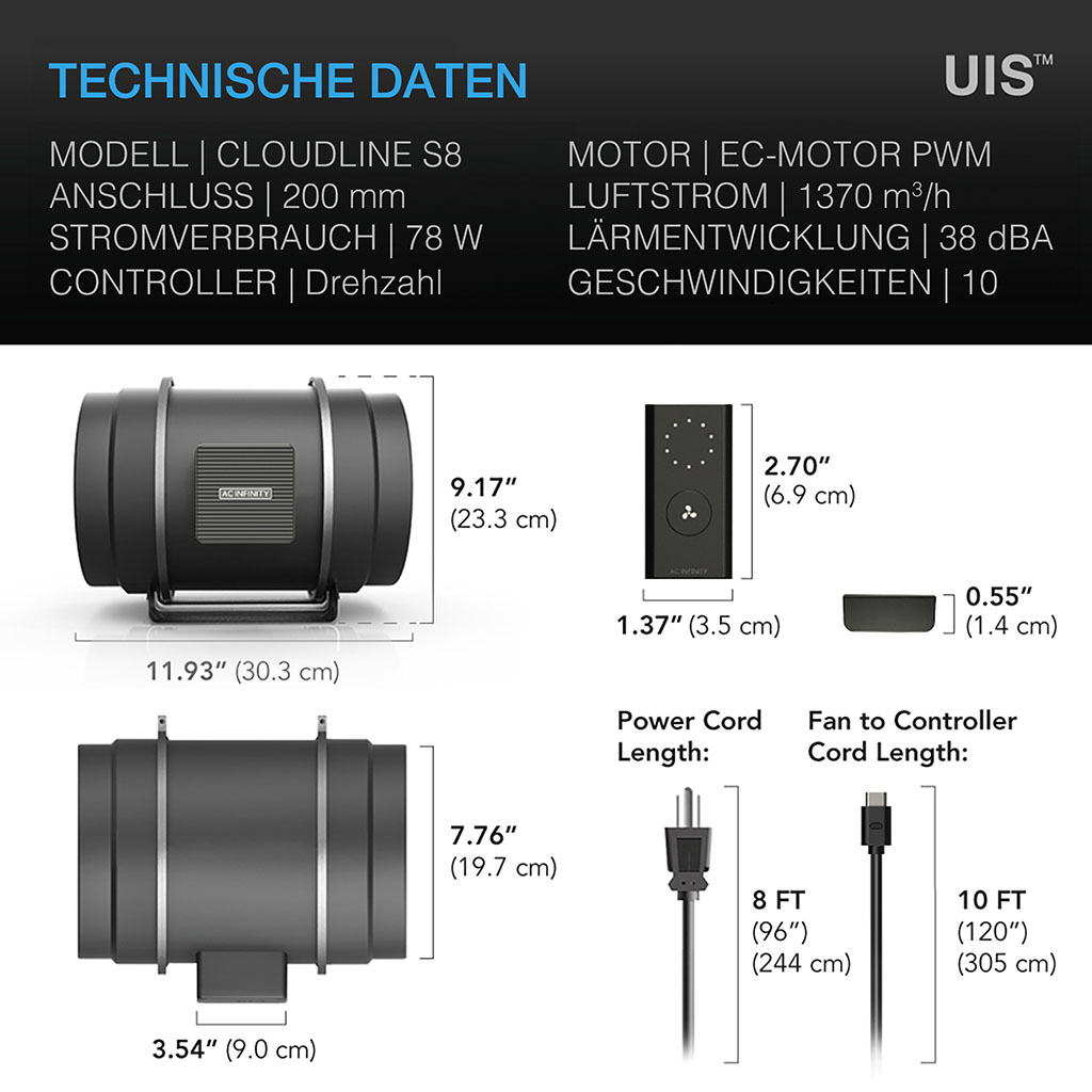 A smart ventilation unit for grow tents that provides low-noise ventilation, assists with heating/cooling and circulates fresh air. The inline duct fan can maintain the air flow even at high static pressure thanks to its inline mixed-flow design. Equipped with a PWM-controlled EC motor, it offers quiet and energy-efficient operation. The housing with motor, fan and blades can be easily removed for cleaning and maintenance purposes. It has an intelligent control system with programmable climate and time functions and can be connected to several UIS controllers. This product is part of the UIS™ platform, which can be combined to create your ideal grow environment.